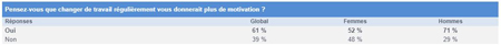 Afin de conserver une certaine motivation, 61 % des Français pensent que le fait de changer de travail régulièrement serait une solution. Sur ce point, les hommes sont nettement plus nombreux (71 %) que les femmes à le penser (52 %).