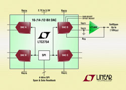 Linear Technology Corporation présente le LTC2754-16, un quadruple convertisseur numérique-analogique (CNA) de 16 bits, à sortie en courant, qui présente une non-linéarité intégrale (INL) et une non-linéarité différentielle (DNL) de ± 1 LSB. Les sorties des quatre CNA peuvent être programmées par des cavaliers entre broche ou par logiciel, en six gammes unipolaires ou bipolaires, via une simple interface série 4 fils. La programmation par logiciel permet de se passer des résistances de précision chères, des étages de gain et de la commutation manuelle par cavalier. Avec ses spécifications de précision en continu et la configuration souple de la sortie par SoftSpan, le LTC2754-16 est idéal pour les systèmes d’acquisition de données à plusieurs canaux et les équipements de tests automatisés. Une option 12 bits, à compatibilité de logiciel et de brochage, est également disponible, facilitant la transition entre différentes résolutions dans le produit final.