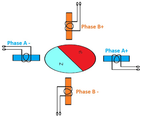 Image 1 : Diagramme d’un moteur pas-à-pas à aimant permanent et à quatre pas. Le rotor est constitué d’un aimant à une paire de pôles et le stator est composé de deux phases, la Phase A et la Phase B.