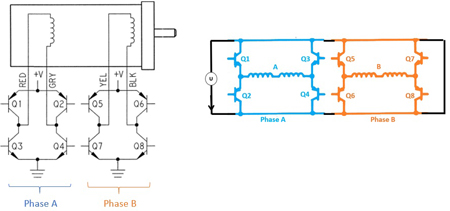 Image 3 : Les moteurs bipolaires ne nécessitent qu’une bobine par phase, et le courant peut circuler dans les deux directions. Pour le contrôle, huit transistors avec deux ponts en H sont nécessaires.