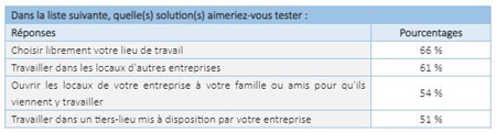 Pouvoir choisir librement son lieu de travail est une solution que 66 % des Français aimeraient pouvoir tester, tout comme 61 % qui voudraient pouvoir travailler dans les locaux d’autres entreprises que la leur. Paradoxalement, seulement 54 % sont disposés à ouvrir leurs propres locaux à des personnes de leur entourage et 51 % sont attirés par des tiers-lieu mis à disposition par leur société.