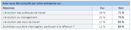 Sur la plupart des sujets liés aux évolutions de la vie des entreprises, les Français déclarent être très peu consultés. 71 % disent ne pas avoir été interrogés sur l’évolution des pratiques de travail, 79 % sur l’évolution du management et 83 % sur l’évolution des lieux de travail. Cependant, ce manque de communication ne semble pas être un problème puisque 89 % ne désirent pas être consultés pour participer à la réflexion.