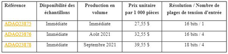 Le µModule ADAQ23875 réduit le cycle de développement des systèmes de mesure de précision à haut débit en exécutant les opérations de sélection, d’optimisation et de layout des composants jusqu’alors prises en charge par le concepteur. En intégrant dans le boîtier une plus grande partie de la chaîne du signal, l’ADAQ23875 permet de répéter le haut niveau de performances pendant toute la durée de vie du système en fabrication, ce qui réduit le coût total pour les équipementiers (OEM). La famille ADAQ2387x est déclinée en résolutions de 16 et 18 bits avec différentes gammes de tension d’entrée.