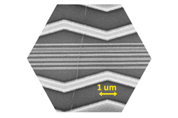 A C12 Quantum Electronics, un qubit, la brique fonctionnelle fondamentale d’un ordinateur quantique, est conçu à partir d’un nanotube de carbone ultra-pur (ligne verticale sur l’image), suspendu au-dessus d’une puce de silicium, contenant les électrodes de contrôle et le bus de communication quantique (lignes horizontales). Les nanotubes de carbone utilisés par C12 Quantum Electronics ne sont composés que d’atomes de carbone d’isotope 12. Sans spin nucléaire, ces atomes ne perturbent pas le qubit de spin.