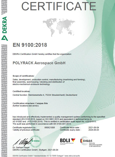 La sécurité, la fiabilité et la qualité sont des priorités absolues dans l’industrie aéronautique, que ce soit au niveau du développement, de la production ou de la maintenance. C’est pourquoi une gestion complète et transparente de la qualité tout au long de la chaîne d’approvisionnement est cruciale. Après sa fondation en 2020, POLYRACK Aerospace GmbH a reçu ce label de qualité conforme à la norme EN 9100 de DEKRA, ce qui représente une nouvelle étape importante pour l’entreprise dans ce segment de marché.