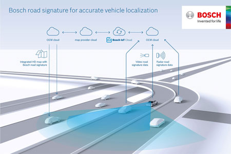 La signature routière de Bosch permet une auto-localisation d’une grande précision : pour déterminer sa position, le véhicule compare en temps réel les informations fournies par ses capteurs d’environnement avec celles de la copie numérique. Cette comparaison permet aux voitures de se localiser au décimètre près dans la voie de circulation par rapport à la carte d’une grande précision. Le recours à des radars rend la localisation possible et efficace même dans des conditions météorologiques défavorables telles que brouillard, pluie et neige, dans lesquelles la détection de l’environnement par caméra s’avère limitée, voire impossible.