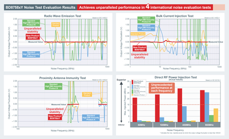 La série EMARMOUR™ est conçue pour éviter les dysfonctionnements dus au bruit sans avoir besoin de prendre des mesures d’application spéciales. La série BD8758xY, en particulier, a démontré des performances supérieures lors de quatre tests internationaux d’évaluation du bruit. Par exemple, dans les essais d’émissions d’ondes radio ISO 11452-2 effectués par les constructeurs de véhicules, la tension de sortie des produits standard fluctue de plus de ±300 mV dans toutes les bandes de fréquences, alors que la nouvelle série BD8758xY réalise ±10 mV ou moins. Dans le même temps, la structure des éléments CMOS permet une amplification précise et à grande vitesse du signal, sans être affectée par le bruit externe lorsqu’elle est installée à l’intérieur des applications de capteurs ciblées. Cela améliore considérablement la fiabilité tout en réduisant les heures de production de conception dans un large éventail d’applications, y compris les systèmes de détection d’anomalies.