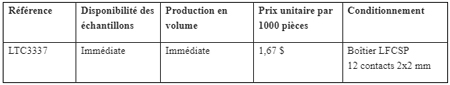 Le circuit LTC3337 intègre une fonction supplémentaire de surveillance pour mesurer et rapporter les paramètres de diagnostic suivants par l’intermédiaire de l’interface I2C : température, tension et impédance de la batterie. Pour accepter une large gamme de valeurs de batterie primaire en entrée, la limite de courant crête d’entrée peut être sélectionnée par broche entre 5 et 100 mA. Grâce à cette flexibilité, le circuit intégré peut présenter à la batterie un profil de charge qui lui permet de fournir sa capacité maximale, indépendamment de la charge effective - une approche « respectueuse de la batterie » qui contribue à prolonger la durée de vie des éléments. Le circuit LTC3337 convient idéalement aux applications à éléments primaires nécessitant une alimentation occasionnelle : installations difficiles d’accès, serrures de porte électroniques ou détecteurs de bris de glace. Cette nouvelle référence est également adaptée aux applications utilisant des éléments de batteries rechargeables.