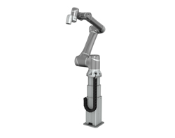Une autre option est Liftkit. Les cobots sont souvent utilisés pour la palettisation, mais ils se heurtent à leurs limites dès que la pile de palettes atteint une certaine hauteur. Le kit ascenseur, simple à monter, augmente la portée de chaque cobot TM. Le cobot se déplace le long d’un axe vertical, ce qui permet d’élever ou d’abaisser la base du cobot pendant le travail de palettisation. Ces déplacements permettent de toujours trouver la position de travail optimale qui rendra l’opération de palettisation plus efficace. En effet, l’augmentation de la portée du Cobot va améliorer la productivité et réduire les coûts. Le Liftkit est un système prêt à être monté et comprend une colonne de levage avec une interface de montage, une commande et un logiciel plug-in TM pour Cobots, permettant la programmation des déplacements de l’ascenseur directement via la commande Cobot. Le système intègre des relais de sécurité redondants et certifiés garantissant un arrêt sûr pendant le fonctionnement. La plaque de montage TM et la colonne sont équipées de trous filetés supplémentaires, ce qui permet de raccorder des systèmes de câblage externes.