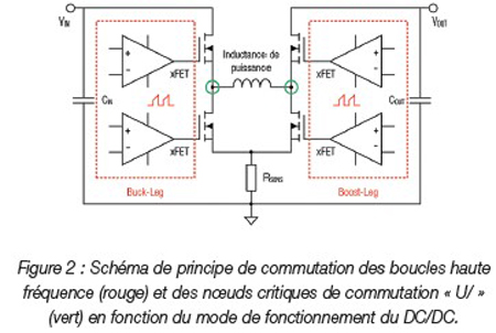 En raison de ces exigences strictes, il est essentiel de créer un agencement très peu inductif et compact, avec des filtres adaptés au convertisseur. En termes de CEM, les câbles d’entrée et de sortie sont les antennes dominantes dans la gamme de fréquences allant jusqu’à 1 GHz. Selon son mode de fonctionnement, le convertisseur présente des boucles de courant à haute fréquence à l’entrée et à la sortie (comme le montre la Figure 2), qui doivent donc être filtrées. Cela permet d’éviter que les interférences à haute fréquence provenant de la commutation rapide des MOSFET ne soient rayonnées par les câbles. Cet exemple d’application offre une grande liberté de conception grâce à une large plage de tension d’entrée allant jusqu’à 60 VCC, une fréquence de commutation réglable et la possibilité de piloter quatre MOSFET externes.