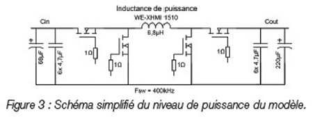 La conception est basée sur un circuit imprimé double face à six couches et une fréquence de commutation de 400 kHz. L’ondulation du courant sur la self doit être d’environ 30 % du courant nominal. Les MOSFET 60 V présentent une faible résistance de passage (RDS(on)) et une faible résistance thermique (Rth). La Figure 3 montre une disposition simplifiée du circuit.