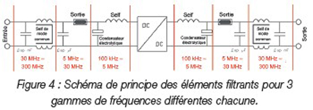 Le principal critère de sélection des composants de filtrage est qu’ils assurent une suppression des interférences à large bande de 150 kHz à 300 MHz pour la CEM par conduction et par rayonnement. L’effort de filtrage peut être réduit si des câbles plus courts ou inexistants sont utilisés à l’entrée ou à la sortie. La Figure 4 montre les plages actives des différents composants du filtre dans la gamme de fréquences respective.