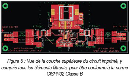 Malgré un agencement très soigné ainsi que des composants actifs et passifs adaptés, aucun convertisseur DC/DC haute puissance conforme à la classe B ne peut être réalisé sans filtres supplémentaires aux spécifications très strictes (longues lignes, absence de blindage, etc.). Toutefois, comme il fallait s’y attendre, il a été possible de mettre en place des filtres appropriés à l’avance. Le résultat est un convertisseur Buck-Boost 100 W flexible, à haut rendement et conforme à la classe B. Pour créer un circuit imprimé encore plus compact, les deux bancs de filtres peuvent être pivotés de 90° ou disposés sur la face inférieure du circuit imprimé. Des logiciels de conception et de simulation comme REDEXPERT et LTSpice permettent d’atteindre rapidement et à moindre coût l’objectif souhaité.