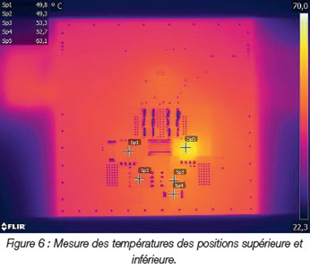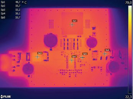 La température maximale des composants mesurée à l’aide d’une caméra thermique est inférieure à 64 °C Figure 6), ce qui signifie une bonne marge de sécurité pour des températures ambiantes plus élevées ainsi qu’une faible contrainte pour les composants. Le rendement est également à un niveau très élevé (mode buck : 96,5 % ; mode boost : 95,6 %), surtout si l’on considère que tous les composants des filtres ont été pris en compte.