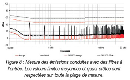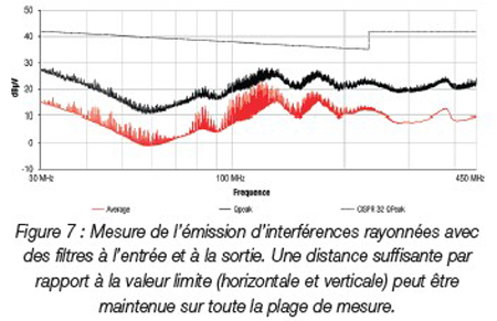 Les Figures 7 et 8 montrent les résultats de mesure améliorés du circuit avec les filtres en place. Tant les pics dans la gamme de fréquences inférieure du rayonnement parasite conducteur que la courbe de mesure complète de l’émission parasite rayonnée présentent désormais une réserve suffisante en dessous des valeurs limites requises.