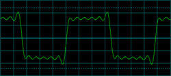 Imaginons un signal carré à 100Mhz. Un signal carré est un signal complexe de fréquence fondamentale F (ici 100Mhz) sur lequel se superposent des harmoniques de rang N. Sur ce premier chronogramme, j’ai limité le signal à l’harmonique 11. Le signal est assez propre pour servir d’horloge à de nombreux circuits digitaux.