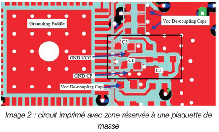Pour la plupart des circuits intégrés, il convient de placer un plan de masse continu sur la couche des composants (couche supérieure ou inférieure du circuit imprimé), directement sous les composants. Ce plan a pour fonction d’acheminer les courants de retour des signaux CC et RF vers le plan de masse attribué. En outre, les « plaquettes de masse » (Image 2) ont pour fonction secondaire de dissiper la chaleur excédentaire et doivent donc être pourvues de via appropriés. Ces via doivent traverser plusieurs couches du circuit imprimé, être métallisés à l’intérieur et remplis de pâte thermo conductrice afin de renforcer l’effet de dissipation.