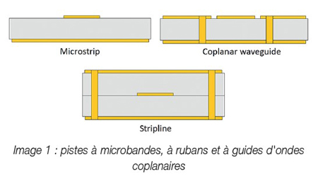 Les circuits RF nécessitent des lignes de transmission (microbandes, rubans, guides d’ondes coplanaires, etc.) dont les impédances doivent être rigoureusement ajustées afin d’éviter les pertes de puissance et de garantir l’intégrité du signal. L’impédance caractéristique des lignes de transmission à microbandes (Image 1), dont les valeurs typiques sont de 50 Ω et 75 Ω, dépend de la largeur de la piste, de l’épaisseur de la couche et du type de diélectrique. Les microbandes sont utilisées sur les couches externes, tandis que les lignes à rubans sont utilisées sur les couches internes. Les guides d’ondes coplanaires (mis à la masse), en revanche, offrent le meilleur degré d’isolation, notamment dans le cas de signaux RF qui parcourent des pistes très proches.