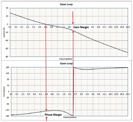 Pour ce faire, on utilise la réponse de transmission de boucle (ou gain de boucle). Théoriquement, tant qu’il existe une petite marge de gain et de phase, le système est stable. En pratique, pour qu’un système soit robuste il faut une marge de gain d’au moins 6 dB et une marge de phase d’au moins 30°. La marge de gain est la différence entre la ligne 0 dB et la courbe de gain à la fréquence où la phase croise 180°. La marge de phase est mesurée à partir de la courbe de phase jusqu’à 180° à la fréquence où le gain de boucle croise la ligne 0 dB.