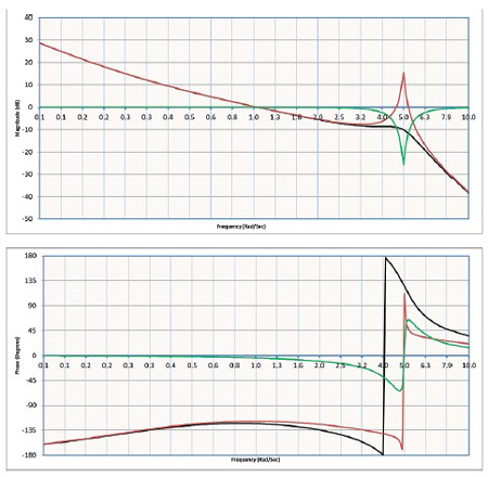En éliminant la résonance de la boucle de commande, il devient possible d’augmenter le gain global du système, d’élargir la bande passante pour obtenir des temps de montée plus courts et, en fin de compte, d’accroître les performances de la machine. Dans le schéma ci-dessous, l’entrée est en rouge, le filtre coupe-bande est en vert, et la réponse résultante est en noir.