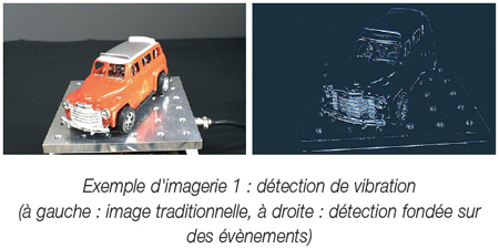 Les capteurs Event-Based Vision Sensors* détectent de manière asynchrone les changements de luminance de chaque pixel et renvoient uniquement les données modifiées, en les combinant avec des informations temporelles et de position du pixel (coordonnées xy), permettant ainsi un flot de données à haute vitesse et à faible latence.