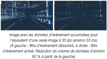 La construction empilée exclusive a permis à Sony d’opter pour une méthode évènementielle qui détecte de manière asynchrone les changements de luminance des pixels et génère des données combinant position des pixels (coordonnées xy) et informations temporelles. Contrairement à la méthode fondée sur les clichés, elle permet aux capteurs de lire uniquement les données utiles, réduisant ainsi l’énergie consommée, mais avec une vitesse élevée de l’ordre de la microseconde et une faible latence, permettant ainsi un flot de données temporelles haute définition.