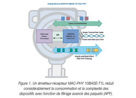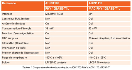 Commercialisé par ADI sous la référence ADIN1110, l’émetteur-récepteur MAC-PHY 10BASE-T1L assure une connectivité Ethernet basse consommation via une interface SPI reliée à un processeur hôte avec une consommation de seulement 42 mW. L’ADIN1110 est compatible avec l’interface série MAC-PHY 10BASE-T1x de l’Open Alliance pour des communications SPI en duplex intégral à la fréquence d’horloge de 25 MHz. Pour sa part, l’émetteur-récepteur PHY 10BASE-T1L ADIN1100 d’ADI assure une connectivité Ethernet basse consommation via les interfaces MAC MII, RMII et RGMII avec un processeur hôte, moyennant une consommation d’énergie de seulement 39 mW (le tableau 1 compare les caractéristiques des références ADIN1100 et ADIN1110). Ces deux produits s’appuient sur les capacités 10BASE-T1L d’un schéma de communications point à point, équilibré en courant continu et fonctionnant en full-duplex avec modulation PAM 3, débit symboles de 7,5 MBauds et codage 4B3T. Avec le second mode d’amplitude (1,0 V crête à crête), cette nouvelle technologie de couche physique peut également être déployée dans un environnement où sont utilisés des systèmes antidéflagrants (codification « Ex-proof ») tout en respectant des plafonds de consommation d’énergie stricts.