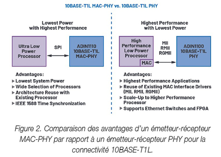 L’utilisation d’émetteurs-récepteurs PHY 10BASE-T1L et MAC-PHY 10BASE-T1L apporte des avantages significatifs dans différents scénarios. Pour les applications où la consommation est un paramètre critique, un émetteurrécepteur MAC-PHY 10BASE-T1L apporte une plus grande flexibilité dans le choix du processeur hôte, en permettant notamment d’utiliser un processeur très peu gourmand sans contrôleur MAC intégré. En cas de mise à niveau vers Ethernet d’un dispositif existant, un émetteur- récepteur MAC-PHY 10BASE-T1L permet de réutiliser le processeur existant et d’ajouter la connectivité Ethernet via un port SPI, évitant ainsi d’installer un processeur plus encombrant embarquant un contrôleur MAC.