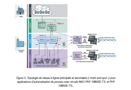 La connectivité des appareils de terrain nécessite à la fois des émetteurs-récepteurs PHY 10BASE-T1L et MACPHY 10BASE-T1L pour permettre à une large gamme d’appareils de bénéficier de la connectivité Ethernet. Les appareils de terrain de forte puissance, tels que les débitmètres, utiliseront un processeur haute performance avec contrôleur MAC intégré doté d’une puce PHY 10BASE-T1L. En revanche, les appareils de terrain basse consommation, parmi lesquels les capteurs de température architecturés autour d’un processeur très basse consommation sans contrôleur MAC, opteront pour une puce MAC-PHY 10BASE-T1L pour assurer la connectivité Ethernet via une interface SPI reliée au processeur (Figure 3).