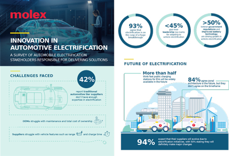 Molex, leader mondial de l’électronique et entreprise innovante en matière de connectivité, a dévoilé aujourd’hui les résultats de sa dernière enquête mondiale menée auprès d’intervenants du secteur automobile, visant à identifier les principaux obstacles et tendances en matière d’innovation dans le domaine des véhicules électriques. Étant donné qu’elle est un catalyseur majeur de changement dans l’architecture complète des véhicules, y compris des bornes de recharge, une électrification réussie exige une collaboration accrue entre les fabricants automobiles de l’équipement d’origine et leurs fournisseurs, des investissements plus importants en recherche et développement et en capital, ainsi que la conception, le développement et la fourniture de technologies révolutionnaires dans les secteurs de la commande de puissance et de la gestion de batterie.