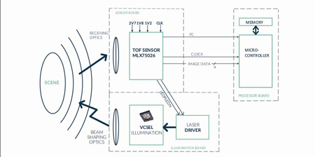 Melexis a récemment présenté les capteurs ToF MLX75027 (VGA) et MLX75026 (QVGA), qui permettent d’obtenir des résolutions plus élevées et moins ambiguës sur de longues distances, en utilisant des fréquences de modulation plus basses. En outre, ces capteurs ont été certifiés pour une utilisation dans la plage de température allant de -40 à 105°C, ce qui en fait de bons candidats pour les applications automobiles. Mais il n’y pas que le capteur qui est important dans ces mesures. Un autre composant essentiel est l’unité d’éclairage, qui comprend les composants émetteurs de lumière et les circuits de commande correspondants.