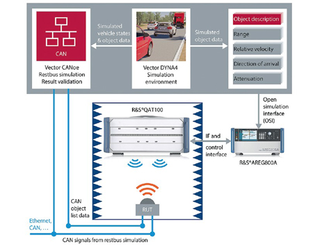 Le système de test combine deux solutions. D’une part, le logiciel de test de conduite virtuelle Vector DYNA4, qui simule l’environnement et fournit l’interface utilisateur nécessaire à la configuration du scénario de test et à son exécution. D’autre part, le système de test radar Rohde & Schwarz qui génère des objets artificiels dynamiques à destination du capteur radar sous test sur la base des listes d’objets ASAM OSI implémentées dans le logiciel de simulation de l’environnement DYNA4. Vector CANoe reçoit les signaux de sortie du bus du capteur radar correspondant aux objets détectés, puis le logiciel les analyse et les visualise.