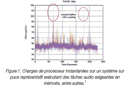 La figure 1 représente un système sur puce exécutant une charge de traitement audio en temps réel, où la charge du processeur (CPU) atteint un pic élevé lorsque des tâches sont traitées en priorité. Ces pics peuvent se produire en raison d’activités sollicitant le système sur puce : rendu multimédia, navigation ou exécution d’applications sur le système, par exemple. Lorsque les pics dépassent 100 % de la charge du processeur, le SoC ne fonctionne plus en temps réel, ce qui provoque des microcoupures audio.
