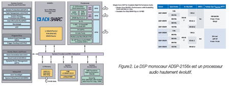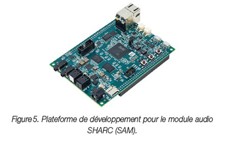Il apparaît clairement qu’un DSP spécialement conçu pour les applications audio repose sur un écosystème nettement plus solide pour développer des systèmes acoustiques complexes, qu’il s’agisse des bibliothèques d’algorithmes, des pilotes de périphériques optimisés, des systèmes d’exploitation en temps réel (RTOS) ou des outils de développement d’utilisation aisée. De plus, si les plateformes de référence dédiées aux applications audio (la plateforme audio SHARC d’ADI illustrée à la figure 5, par exemple) et capables d’accélérer la mise sur le marché sont peu nombreuses pour les SoC, elles sont relativement courantes sur le marché des DSP audio autonomes.