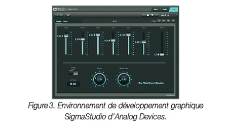 À titre d’exemple, l’environnement de développement audio graphique SigmaStudio® d’ADI intègre de nombreux algorithmes de traitement du signal dans une interface graphique (GUI) intuitive, ce qui permet de créer des flots de signaux audio complexes. En prenant également en charge la configuration graphique Automotive Audio Bus (A²B) pour transporter les données audio, cet outil contribue grandement à accélérer le développement de systèmes acoustiques en temps réel.