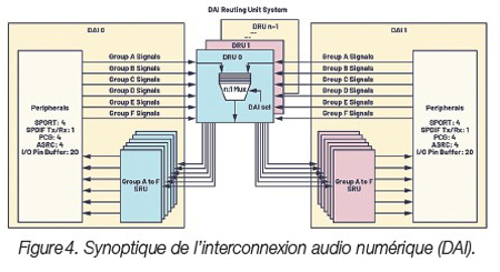En raison de la prolifération du nombre de canaux audio, des flux de filtrage et de la fréquence d’échantillonnage, il est important de disposer d’une interface de brochage affichant une flexibilité de configuration maximale pour assurer la conversion de la fréquence d’échantillonnage en ligne, d’une fonction de cadencement d’horloge haute précision et de ports série synchrones à haut débit pour acheminer les données efficacement, mais également éviter une latence supplémentaire ou le recours à une logique d’interface externe. L’interconnexion audio numérique (DAI) dont bénéficient les processeurs de la famille SHARC® d’ADI illustre cette capacité, comme le montre la figure 4.