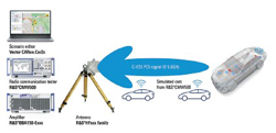 La solution de test se compose d’un testeur de radiocommunications R&S CMW500, d’un générateur de signaux vectoriels R&S SMBV100B (utilisé en laboratoire uniquement), du logiciel Vector CANoe Car2x, d’un amplificateur R&S BBA150 et d’une antenne R&S HF918 (avec trépied et adaptateur). Cette solution permet de générer aisément des signaux d’une puissance atteignant 33 dBm, puissance requise sur certains marchés pour les véhicules d’urgence. La synchronisation des véhicules simulés et du véhicule de test déployé sur le circuit d’essai avec de réelles sources GNSS permet de vérifier en temps réel des scénarios de trafic complexes.