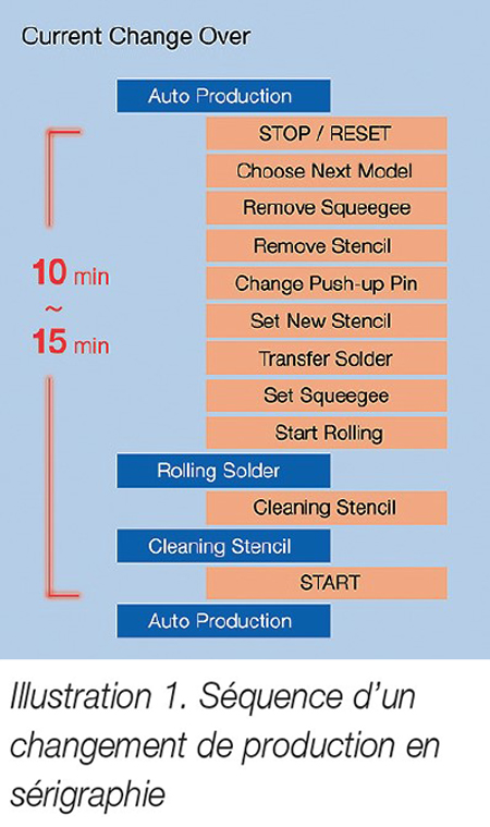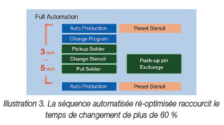 L’ensemble du processus de changement se réduit à 3 à 5 minutes seulement et la production peut reprendre immédiatement, sans autre vérification, réglage ou conditionnement de la pâte à braser. La séquence indiquée sur l’Illustration 3 montre cette réduction drastique du temps de changement.