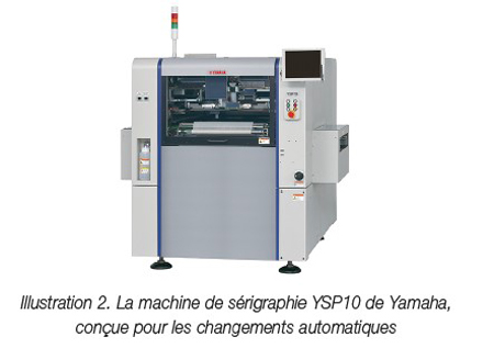 Parmi ces tâches, les opérations telles que le retrait et le remplacement du pochoir nécessitent généralement un opérateur parfaitement formé pour être exécutées correctement. Ce sont des tâches minutieuses, généralement difficiles à automatiser lors des changements de produits en sérigraphie. Aujourd’hui, après avoir revu en profondeur la structure interne de sa machine de sérigraphie standard, Yamaha a créé la nouvelle YSP10 (Illustration 2), lauréate du prix Global SMT, qui permet des changements automatisés : remplacement du pochoir, repositionnement des pions de maintien des cartes, retrait et remplacement du rouleau de pâte à braser sur le pochoir suivant.
