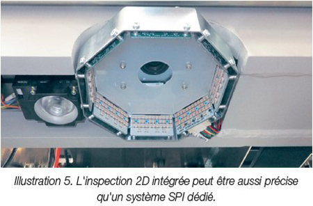 D’après un utilisateur basé en Belgique travaillant sur une ligne de production dédiée à l’assemblage automobile, le système d’inspection en 2D intégré de notre machine de sérigraphie YSP10 affiche une précision comparable à celle d’un système d’inspection de la pâte à braser (SPI) dédié en 3D. De fait, ce système 2D intégré (Illustration 5) garantit des résultats fiables d’inspection de la pâte à braser dans le temps de cycle standard de la machine de sérigraphie. Doté d’un champ de vision de 30 mm x 22,5 mm et d’une résolution de 18,7 μm, ce système peut déceler les défauts de sérigraphie sur des modèles de dépôt délicats pour des composants tels que les petites puces CMS et les boîtiers BGA de 0,5 mm. Il renvoie alors automatiquement des informations pour déclencher le nettoyage du pochoir si des problèmes de pâte sont décelés.