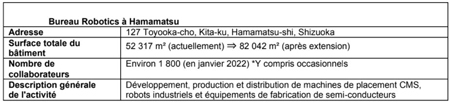 Ces travaux d’agrandissement et de rénovation porteront la superficie totale des bureaux à environ 82 000 m2 (1,6 fois la surface existante). La surface de production sera quant à elle 1,8 fois supérieure à ce qu’elle est actuellement, pour une capacité de production de machines de report de composants doublée. Ce projet inclut également l’extension de l’espace de recherche et l’amélioration de l’environnement d’évaluation et des laboratoires, afin de favoriser un développement régulier de nouveaux produits. L’entreprise envisage aussi de réaliser des bureaux plus modernes en installant des showrooms intelligents et en tendant vers la neutralité carbone. Le projet devrait améliorer les systèmes de fabrication, de vente, de technologie et de service après-vente dans ce nouvel environnement. L’extension et la rénovation des infrastructures font partie de l’investissement stratégique de l’entreprise dans les activités prometteuses, dans le cadre de son nouveau plan de gestion à moyen terme (2022-2024). Yamaha Motor poursuivra l’amélioration des systèmes de technologie, de vente et de services dédiés à ses clients, qui font déjà la force de son unité Robotics, et souhaite augmenter sa rentabilité en étendant sa portée et son offre sur un marché en pleine croissance.