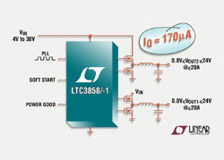Linear Technology Corporation présente le LTC3858/-1, un contrôleur DC/DC, abaisseur, synchrone, à faible courant de repos, à sorties deux phases, qui ne consomme que 170 µA avec une sortie active et 300 µA lorsque les deux sorties sont actives. Avec ses deux sorties à l’arrêt, le LTC5858/-1 consomme à peine 8 µA, ce qui est idéal pour les applications de l’automobile et les PC blocs-notes. La large gamme de tensions d’entrée du LTC3858/-1, de 4 V à 38 V, constitue une protection contre les impulsions transitoires d’entrée rencontrées dans l’automobile, dans les conditions de rupture de charge et de démarrage à froid, et couvre une large gamme d’éléments de batterie de différentes constitutions chimiques. Chacune des tensions de sortie peut être réglée entre 0,8 V et 24 V, pour des intensités de sortie jusqu’à 20 A avec un rendement pouvant atteindre 95%. Le LTC3858/-1 convient pour l’alimentation de systèmes très performants incluant ceux des secteurs de la navigation, de l’audio, des télécommunications, des lecteurs CD/DVD et des pilotes de disques.