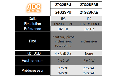 AGON by AOC est allée encore plus loin et a revisité ces modèles en passant leur fréquence à 165 Hz. Dès leur arrivée dans les prochaines semaines, les 24G2SPU et 27G2SPU remplaceront les 24G2U et 27G2U. Tous deux sont équipés d’un pied ergonomique permettant de régler la hauteur de l’écran, mais aussi la rotation horizontale et l’inclinaison, ainsi que le pivot à 90°, autant de paramètres indispensables pour trouver la meilleure posture de jeu tout en offrant de multiples possibilités pour des configurations multi-écrans. Ils embarquent également un hub USB 3.2 à 4 ports afin que les gamers puissent lui raccorder directement leurs claviers et souris, réduisant de fait l’encombrement du bureau, mais aussi 2 haut-parleurs de 2 W chacun.