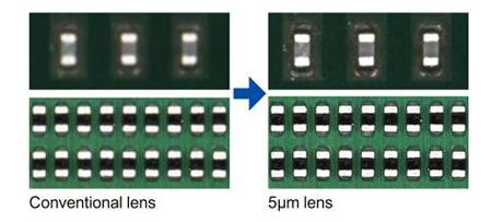 Pour conserver une image nette alors que la taille des composants ne cesse de diminuer, il faut optimiser l’éclairage, la résolution de la caméra et les caractéristiques de l’objectif. Sur son dernier système AOI en 3D YRi-V, Yamaha combine une caméra 12 mégapixels avec un meilleur objectif de 5 µm (Illustration 1) en complément des objectifs de 12 µm et 7 µm. Dans le cadre de l’inspection à grande vitesse d’assemblages CMS, l’objectif haute résolution facilite le contrôle des plus petits composants (par ex. les puces CMS 0201 mm). Il est couplé au nouveau système d’éclairage coaxial de l’YRi-V, spécialement conçu pour faciliter la détection des défauts les plus infimes. Cet éclairage coaxial peut être configuré pour être utilisé dans des routines automatisées ou lors d’une simple étape d’inspection, afin d’aider l’YRi-V à déceler des défauts comme des rayures et des craquelures sur des composants tels que les WLCSP, dont la surface est brillante et réfléchissante.