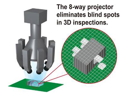 De nouvelles fonctions, comme un projecteur 8 directions (Illustration 2), disponible avec le système YRi-V de Yamaha, permettent de surmonter ces problèmes. La distance de mesure maximale passe également à 25 mm. Ce projecteur amélioré évite les ombres en assurant un éclairage uniforme de tous les éléments dans le champ de vision. Sa portée étendue permet d’inspecter les détails de tous les composants, quelle que soit leur taille.