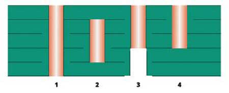 Les vias mécaniques sont eux-mêmes séparés en 4 catégories nommément les vias traversants (1), enterrés (2), vias avec backdrilling (3) et les vias borgnes un équivalent aux microvias qui sera abordé juste après (4).