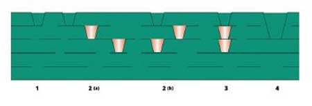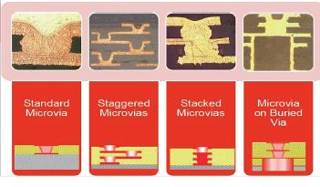 Ces vias ont permis l’apparition de microvias d’un diamètre inférieur ou égal à 100μm. On y retrouve les vias borgnes (1), les vias empilés/décalés ou les staggered vias (2(a) et 2(b)), les vias empilés ou stacked via (3).