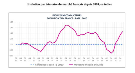 Le marché français continue de bénéficier d’une dynamique soutenue qui confirme les tendances du quatrième trimestre 2021. Des tensions d’approvisionnement demeurent car globalement la demande reste supérieure à la capacité des fabricants de semiconducteurs à livrer le marché.