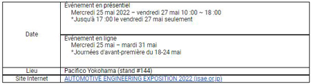 Du 25 au 27 mai, KYOCERA Corporation a participé au salon « Automotive Engineering Exposition 2022 YOKOHAMA » au Japon, organisé au centre de conférence PACIFICO Yokohama (Yokohama, Kanagawa). L’exposition de Kyocera (stand #144) a présenté nos toutes dernières innovations technologiques en matière de conduite autonome autour du thème « Rassembler les communautés grâce à la technologie de mobilité Kyocera ».