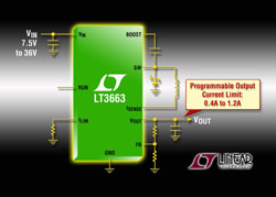 La tension de sortie et l’intensité de sortie du LT3663 sont toutes les deux réglables. Les tensions de sorties à partir de 0,8V sont fixées par un diviseur résistif, tandis que l’intensité de sortie est programmable par l’utilisateur de 0,4 A à 1,2 A, via une résistance externe. Le LT3663 comporte un oscillateur 1,5 MHz, une compensation interne et une diode élévatrice interne pour minimiser les dimensions de la solution entière. Combiné avec un boîtier DFN de 2 mm x 3 mm, il offre un régulateur, à forte tension d’entrée, très compact.